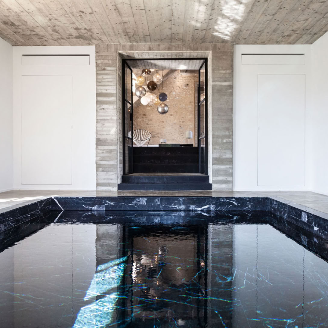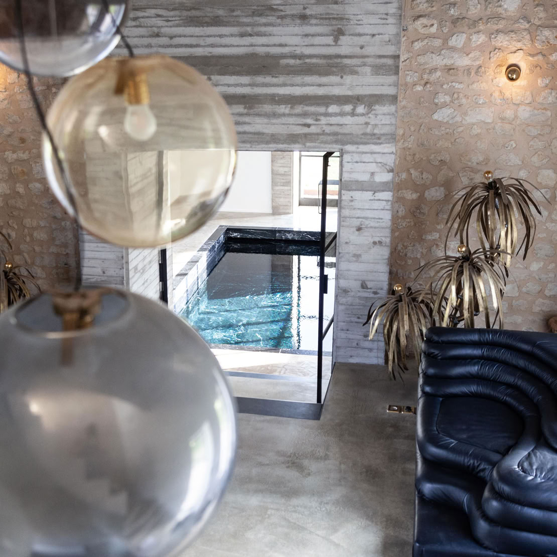 La maison est équipée de deux piscines chauffées (intérieure toute l'année et extérieure aux beaux jours), de deux saunas et de deux hammams.